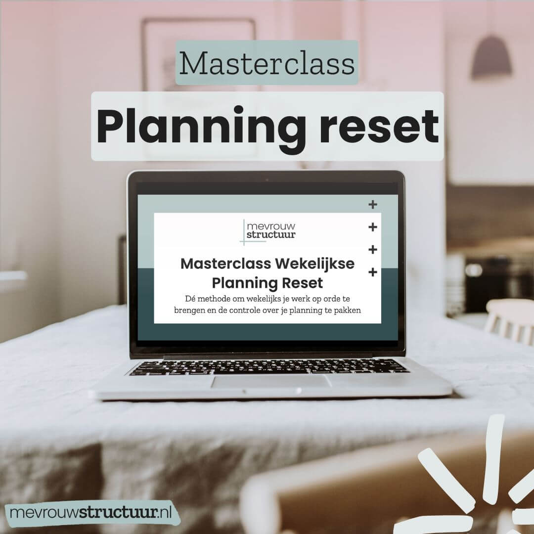 - Je alleen een planning maakt voor je privéleven. De masterclass is gericht op een planning reset voor werk. Je kunt het wel op privé toepassen maar daar focus ik niet op. Kun je op privégebied advies gebruiken, dan raad ik mijn online cursus Structuur in Huis aan.